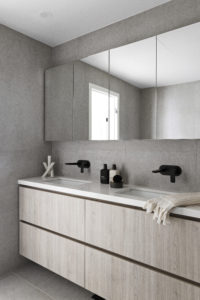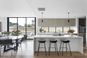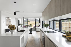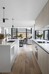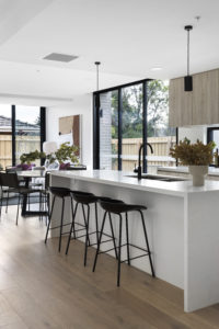 Cinder contrasted sleek black cabinetry and dark timber finishes against crisp white walls, adding depth and a refined modern edge to the light-filled interiors.